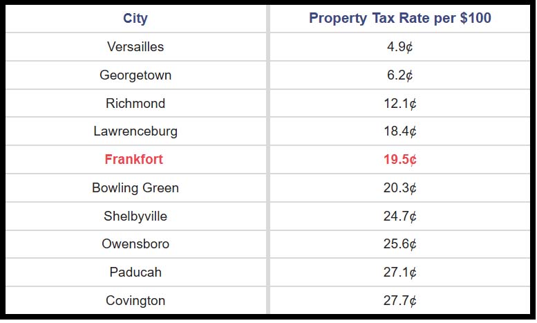 At 19.5 cents, Frankfort’s rate remains squarely in the middle of the pack among both neighboring and peer Kentucky cities.